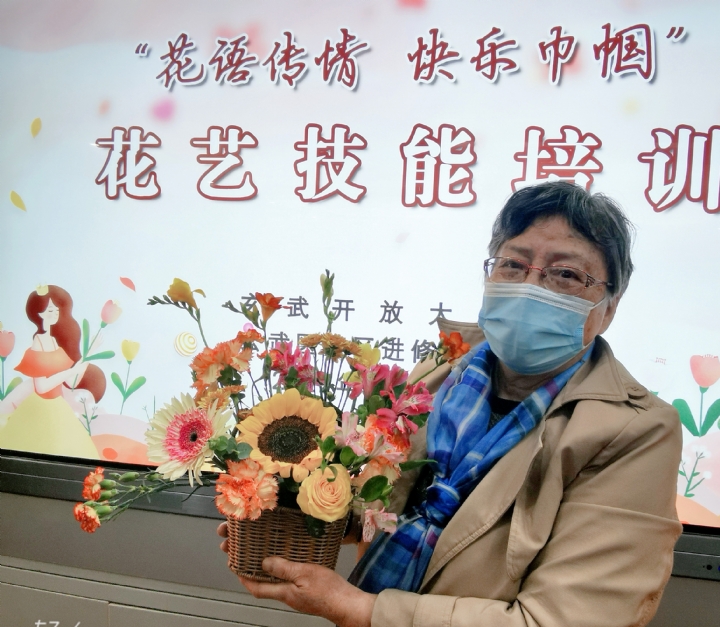 培训中,学员们认真聆听,勤于动手操作,运用刚学来的知识,埋头于自己的“花艺制作中”。当看到自己亲手制作的花蓝变成了错落有致、色彩斑斓、赏心悦目的“花艺”作品。个个都充满了成就感与喜悦感,纷纷拍照留念。活动现场,花香四溢、欢声笑语,在一双双巧手下,花艺作品被赋予了鲜活的生命。居民叶奶奶兴奋地和大家展示着自己的插花作品,并说到:这是我的第一件插花作品,我得拿回家让家人都看看,我也学会插花了。“以前看到别人会插花就觉得十分羡慕,今天通过玄武区社区学院的这次“花艺”培训活动,也让我学习了新技能,心里真是乐开了花。”