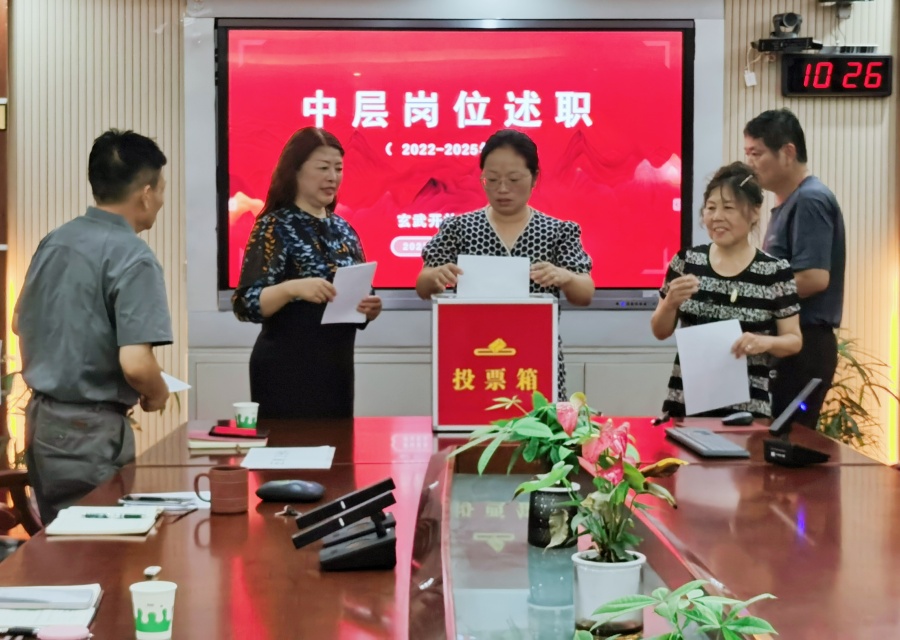 随后各中层干部依次上台述职,既是一次对自己三年来工作回顾的过程,也是一次各部门相互交流学习的机会。述职结束后,全体教职工对中层干部进行民主测评,并从现任副职干部中民主推荐一名正职干部。测评和推荐均采用无记名当场投票的方式,由党支部进行统计汇总,并于会后分组进行谈心谈话,进一步听取教职工的意见,对拟推荐提拔的正职干部充分征求大家意见。