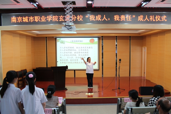 典礼上,2010级财务管理班刘双同学带领大家,右手握拳,用坚定的声音,在国旗下庄严宣誓。2010级学生徐雯同学作为代表道出了十八岁年华的美好和自我的期许。 2012级同学带来的配乐诗朗诵“十八岁畅想曲”召唤“十八岁,我们长大,我们走上理想之路。”2010级财务管理班何丹丹的母亲做为家长代表发言,质朴的话语,无限的期望,言语之间流露出了对同学们十八载的关心和呵护。同时,学校领导王信芳书记为同学们献上最真诚的青春祝福,希望他们志存高远,树立崇高的理想;不断增强自身责任意识;严格自律。王书记激情洋溢的殷切期望给同学们极大鼓励。