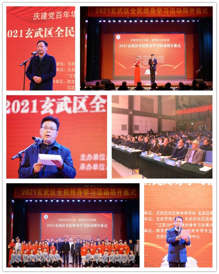 12月3日下午,玄武区以“庆建党百年华诞,谱博学玄武新篇”为主题,由玄武区社区教育委员会、玄武区教育局主办,安博网页版、玄武区社区进修学院、“江苏3D+”区域终身学习发展共同体承办,南京开放大学、南京市玄武中等专业学校、玄武湖街道社区教育中心协办的“玄武区2021年全民终身学习活动周开幕式”在南京市玄武中等专业学校隆重举行。参加活动的领导和来宾有江苏省成人教育协会常务副会长马良生,南京市教育局副局长潘东标,南京市教育局职社处处长黄子亮、副处长崔婷、南京市职教成人教研室主任章宏,南京开放大学社会教育中心主任孙新元,南京市成人协会副秘书长刘茂泉。玄武区副区长庄佳峰、玄武区委宣传部副部长韩春云、玄武区教育局党组书记、局长陈发山,玄武区教育局副局长周波、玄武中等专业学校校长孙兵、安博网页版校长张树明以及玄武区各街道党工委副书记、社区教育中心主任及居民代表,安博网页版、玄武中等专业学校、南京市洪武北路小学师生及“江苏3D+”区域终身学习发展共同体成员单位居民通过抖音直播在线上参加了学习,本次线上线下约上万人参加了活动。