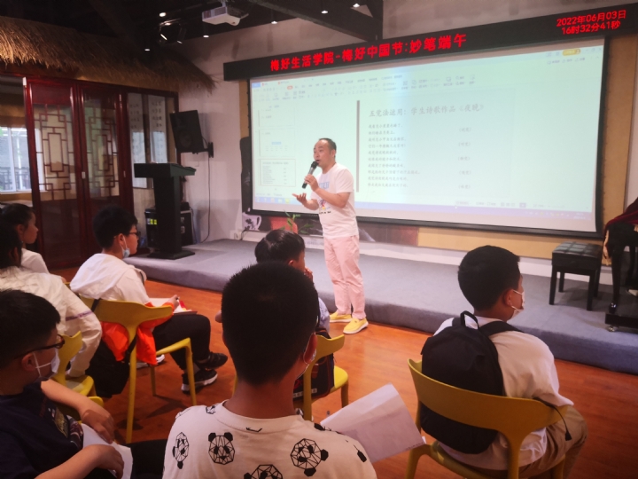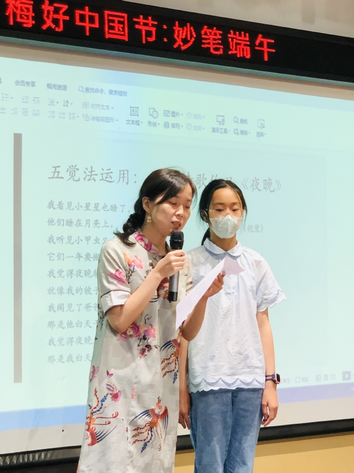 活动中,程教授通过重点讲述端午习俗的历史、文化渊源,以南京丰富的人文景观为例讲述了写作前的观察之道,介绍了独创的符合青少年认知特点的“五觉”写作方法。在创作体验学习阶段,她带着孩子们现场进行了一把“即兴诗歌创作”,神奇的效果让孩子们获得感极强,潜移默化之中完成了对中国历史文化的启蒙,享受了“端午节”的文化盛宴。