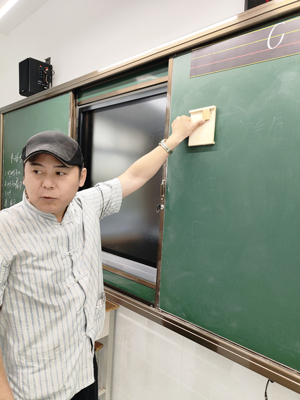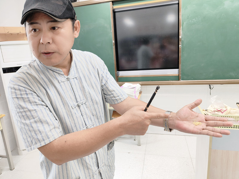 有了上一周的初步感知和了解,同学们对这两门非遗课程不再陌生。今天课上,两位非遗传承人直奔主题,带领学生亲身体验非遗魅力。何胜老师先给每个学生发了一套专用刻刀和他自制的防护器具,随后给每个学生发了一块未打磨的竹牌。让学生学习刻刀的正确使用,通过铲平竹牌表面这道工艺,体会一件竹刻作品完成的不易。谷馆长巡视课堂,提醒学生注意安全,正确使用刻刀,并悉心指导、耐心讲解。一节课的时间过得很快,同学们顺利完成了竹刻的第一步,掌握了刻刀的最基本刀法的运用。