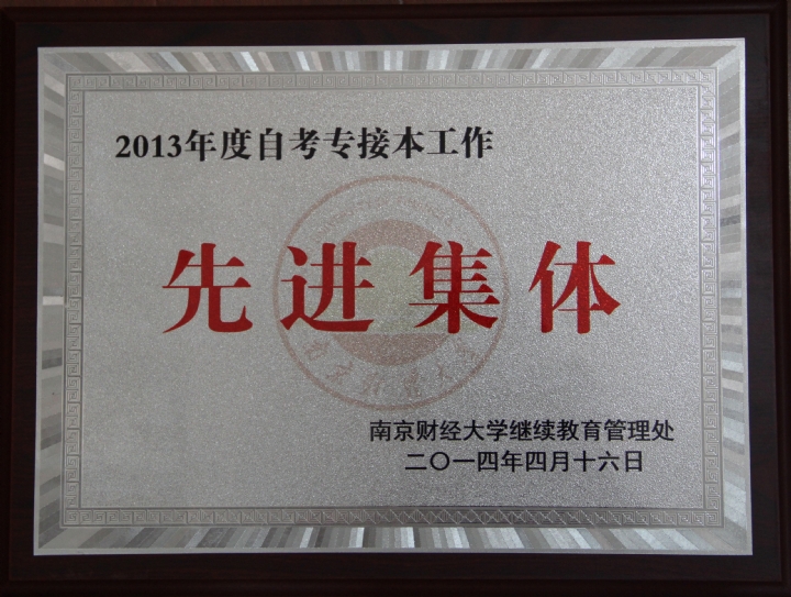 4月17日,在南京财经大学召开2013年度自考专接本工作总结大会上,安博网页版再次荣获南京财经大学继续教育管理处颁发的2013年度自考专接本工作“先进集体”称号。