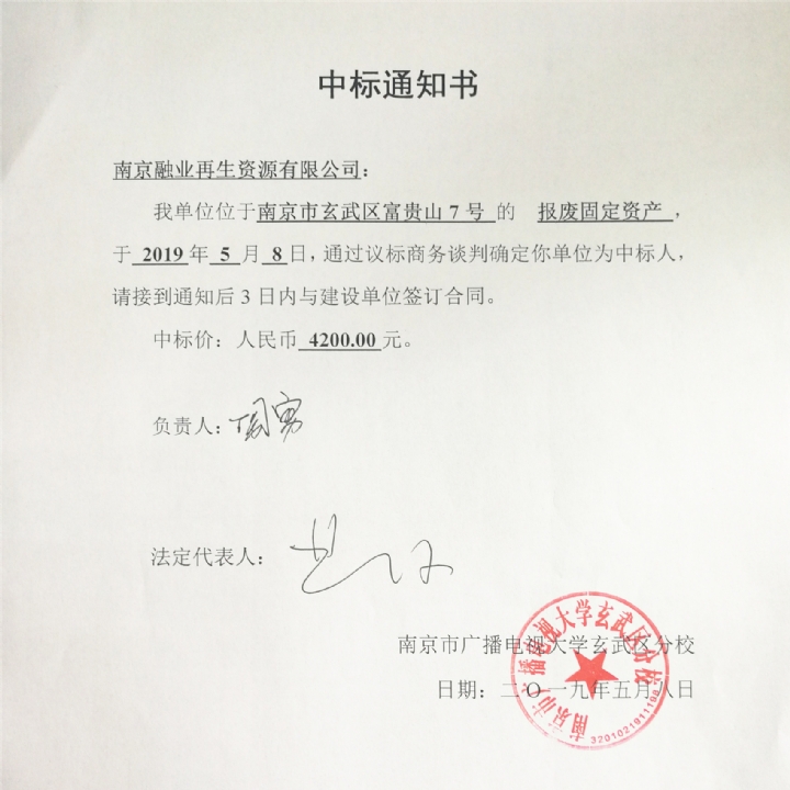 报废固定资产中标通知书