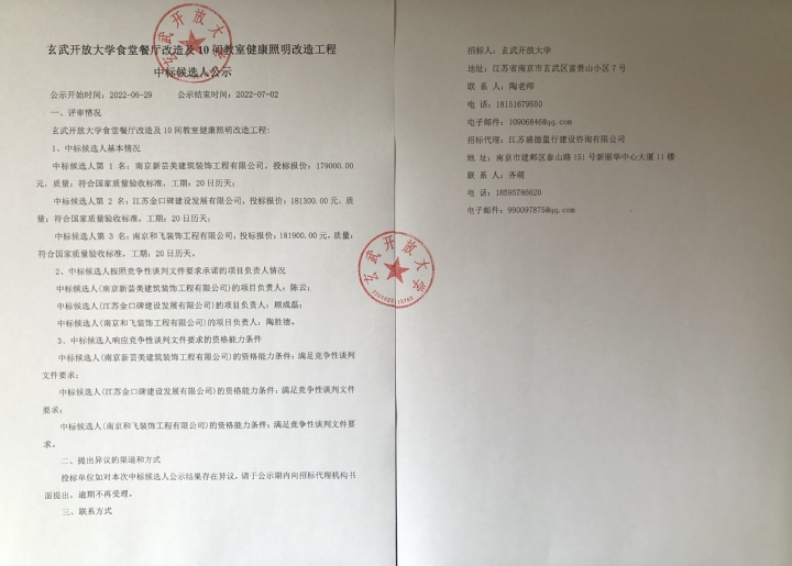 安博网页版食堂餐厅改造及10间教室健康照明改造工程 中标候选人公示
