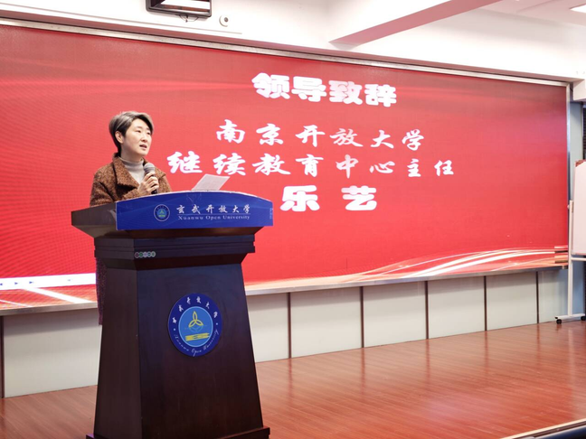 开学典礼在庄严的国歌声中拉开帷幕。南京开放大学继续教育中心主任乐艺致辞。她强调成人教育对终身学习和个人成长的重要意义,励学员要珍惜学习机会,勇攀知识高峰,努力提升自己的技能和素养,在各自的岗位上发光发热,为社会的发展贡献自己的力量。