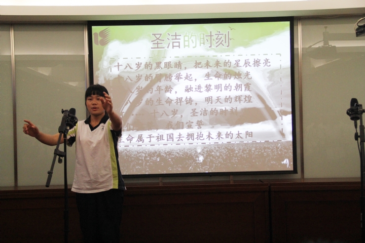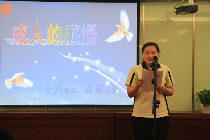 仪式在配乐诗朗诵《十八岁畅想曲》中拉开序幕,学校特意为学生送上了生日蛋糕庆祝大家十八岁共同生日,希望通过这点点烛光,照亮他们的人生,指引他们前进的步伐。同学们面对国旗,右手握拳,用坚定的声音,在国旗下庄严宣誓:“为中华民族的富强、民主和文明,艰苦创业,奋斗终生。”学生代表12财务管理2班蔡阿玲同学发表成人的感悟,十八而志,青春万岁。家长代表12财务管理1班贾军父亲用质朴的话语,流露出对孩子们十八载的关心和呵护,以及对孩子们无限期望,十八而志,梦想起航。王书记代表学校为孩子们送上最真诚的青春祝福,十八而志,责任以行。最后,班主任们为学生佩戴成人纪念徽章,仪式在共唱主题曲《圣洁的时刻》中落下帷幕。