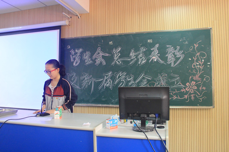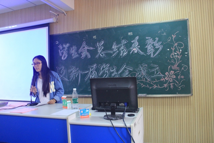 大会在庄严的国歌声中拉开了帷幕。会议由四项议程构成。首先由各部前任部长对学生会一学年的工作进行回顾与总结。随后由团委王文婷老师宣读2014-2015学年优秀学生会干部名单并颁发奖状。学工处朱小利老师宣读2015-2016学年新一届学生会干部名单并颁发聘书。最后由学工处章翠云主任作总结性发言,章主任肯定了老一届学生会干部的工作,并对新一届学生会干部们提出了希望与要求,希望新一届学生会干部能够尽职尽责,不断创新与提高,将学生会工作做得更好。