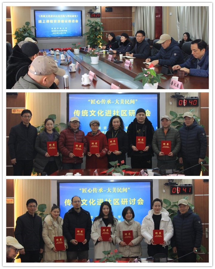 推进会中,张树明校长、业冰院长为10位非遗传承人颁发了玄武区社区进修学院非遗课程讲师聘书。期间,技术老师和主讲老师从项目的历史、工匠介绍手艺的特点及对于技艺的理解和传承的看法。对演示自己的代表作或者制作过程优势交流研讨及课程录制环节达成共识。还将陆续推出玄武社区教育“大美民间”非遗多套系列读本。