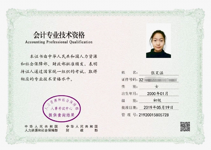 祝贺19级本科2班张笑涵同学取得会计初级职称证书