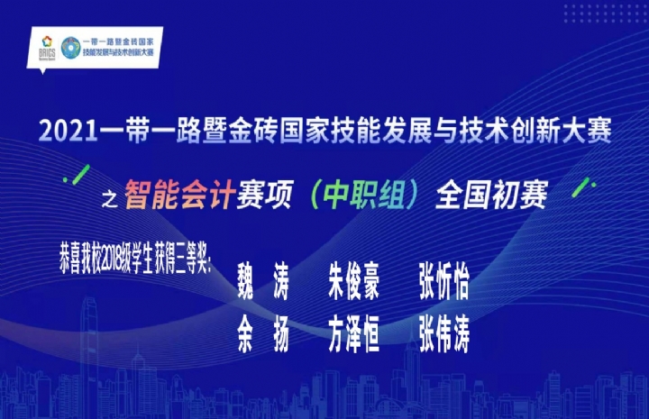 2021年6月19日,在金砖国家工商理事会中方理事会、一带一路暨金砖国家技能发展国际联盟、金砖国家技能发展与技术创新大赛组委会主办的“智能会计赛项(中职组)全国初赛”竞赛中,我校2018级学生魏涛、张忻怡、朱俊豪、余扬、方泽恒、张伟涛6位同学组成2队在杨丽霞和周洁老师的指导下,代表我校参加比赛。本次竞赛共有全国241支代表队参加,经过奋力拼搏,我校2支代表队均荣获三等奖。