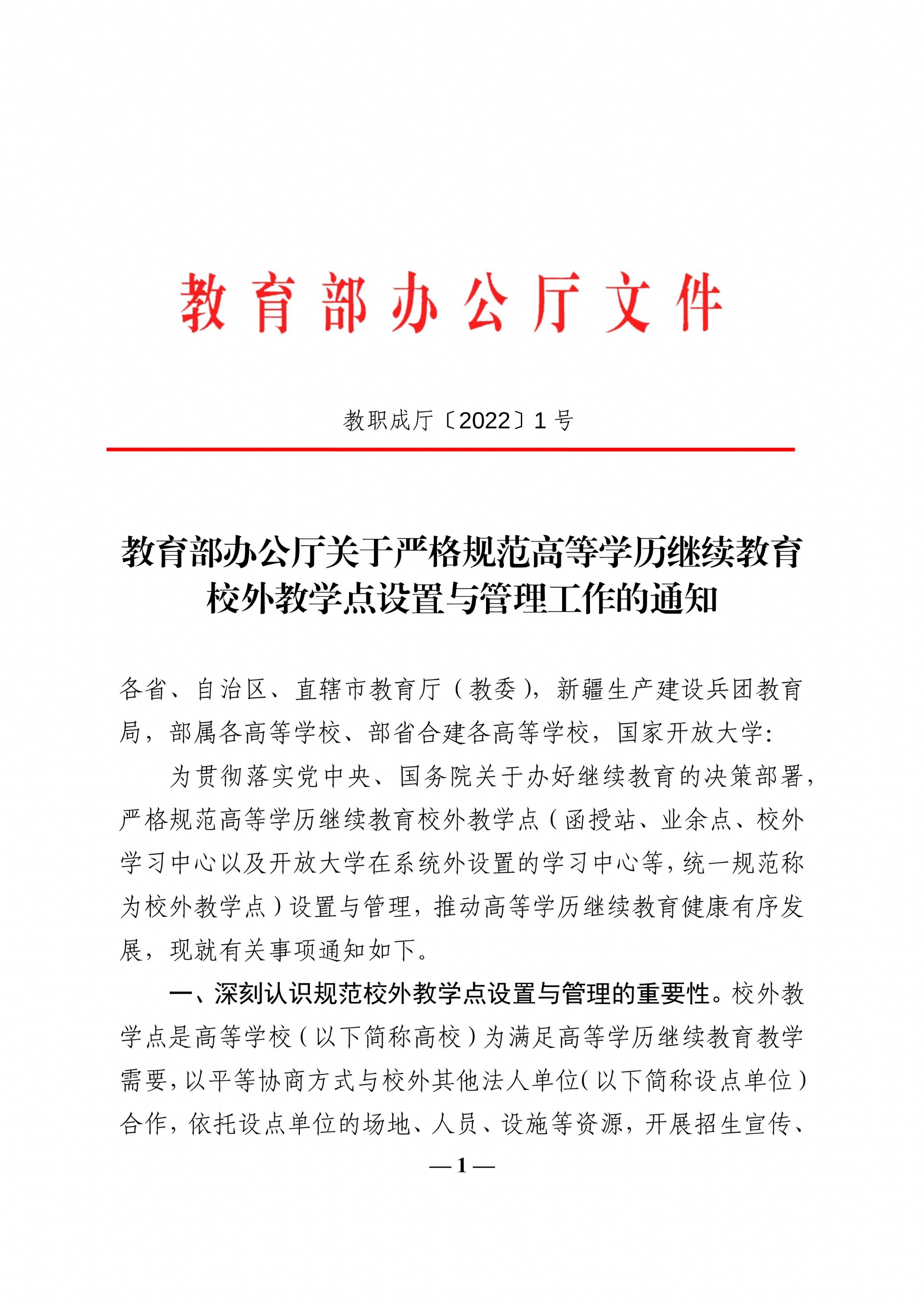 教职成厅〔2022〕1 号 教育部办公厅关于严格规范高等学历继续教育校外教学点设置与管理工作的通知